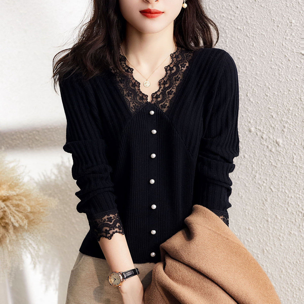 【XS-3XL】triko s výstřihem do V ✨ Nový styl podzimního a zimního krajkového svetru s krajkovým spodním dílem ✨-3838311